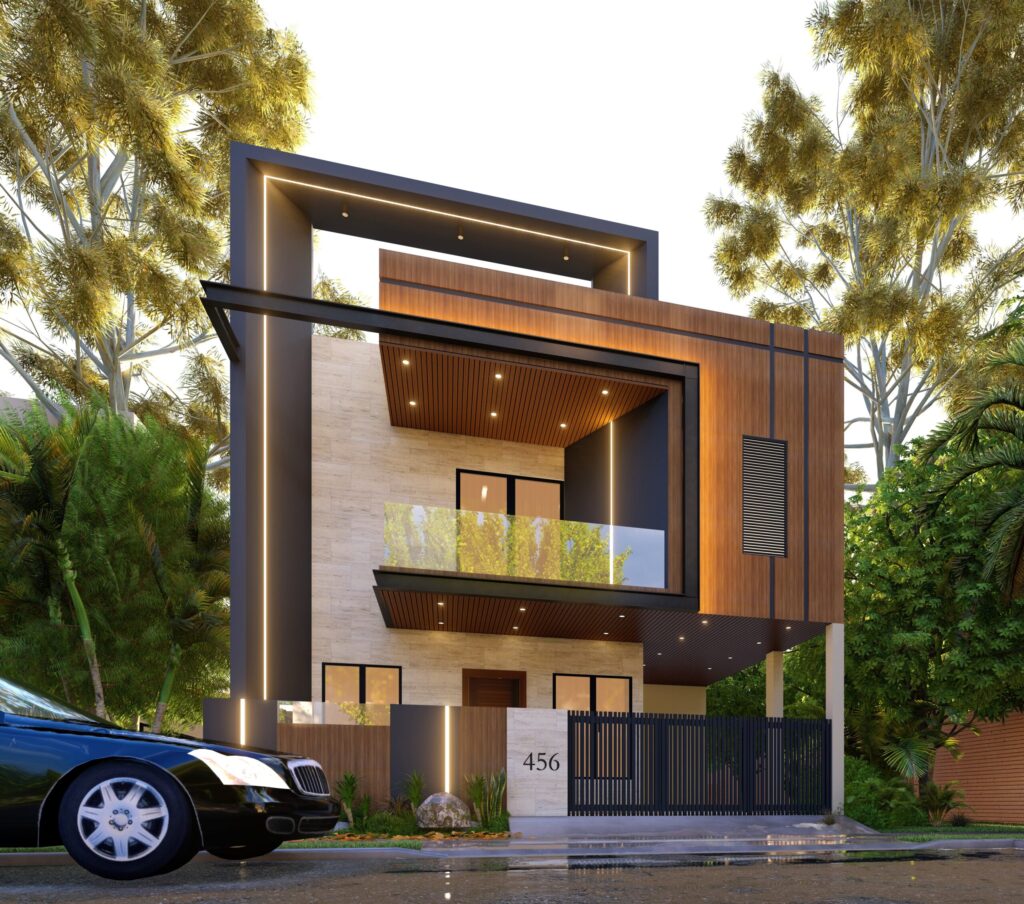 The building features a sleek contemporary architectural design with large glass windows, spacious balconies, and clean lines. The exterior is finished in elegant neutral colors with soft lighting that highlights the structure during evening shots. Surrounding the building are landscaped gardens, paved walkways, and lush green trees that add a luxurious touch to the environment.